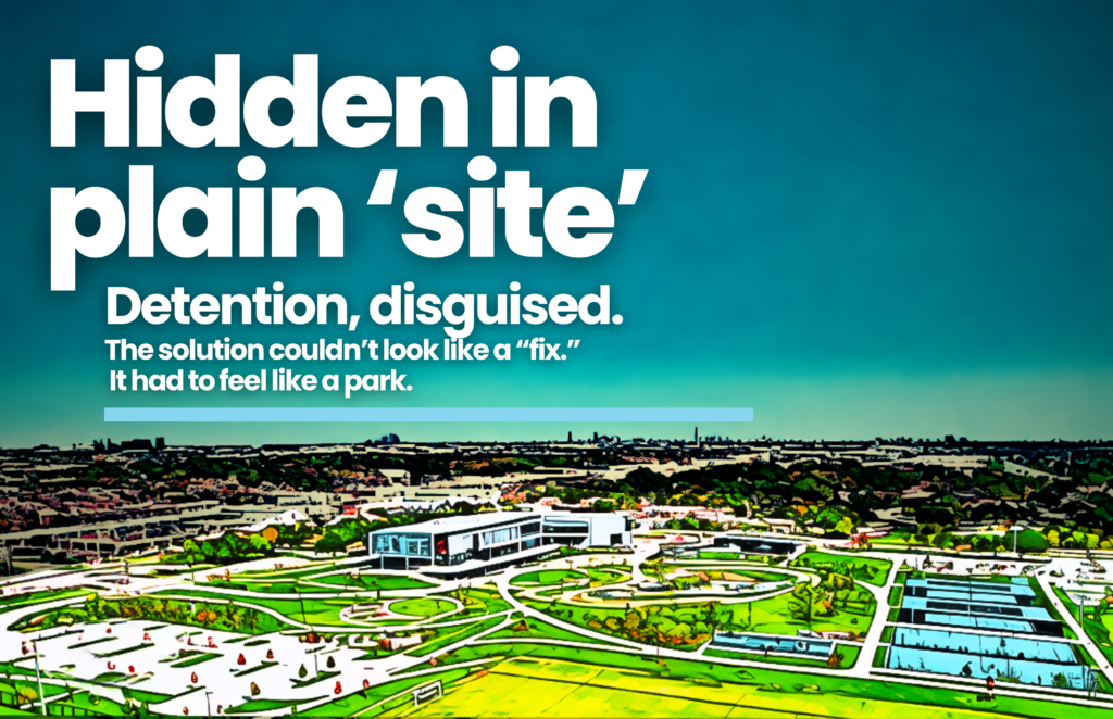 Ten detention ponds were woven through the park — not fenced off in a corner. Soccer fields were sized to hold water during big storms — then snap back to play.