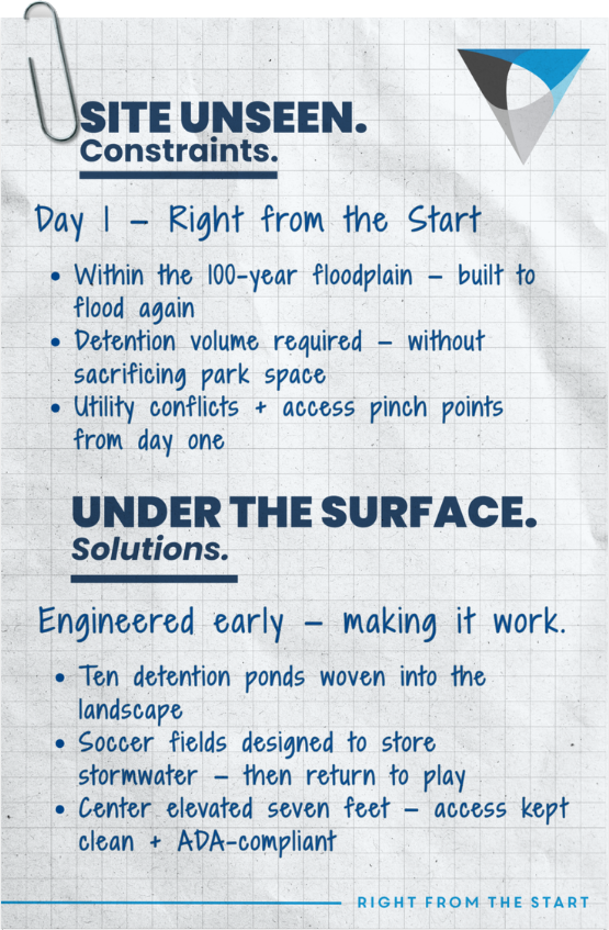 Floodplain sites can still feel effortless. When a soccer field pulls detention duty, it’s not a trick — it’s the simple fix that lets everything else stay true.