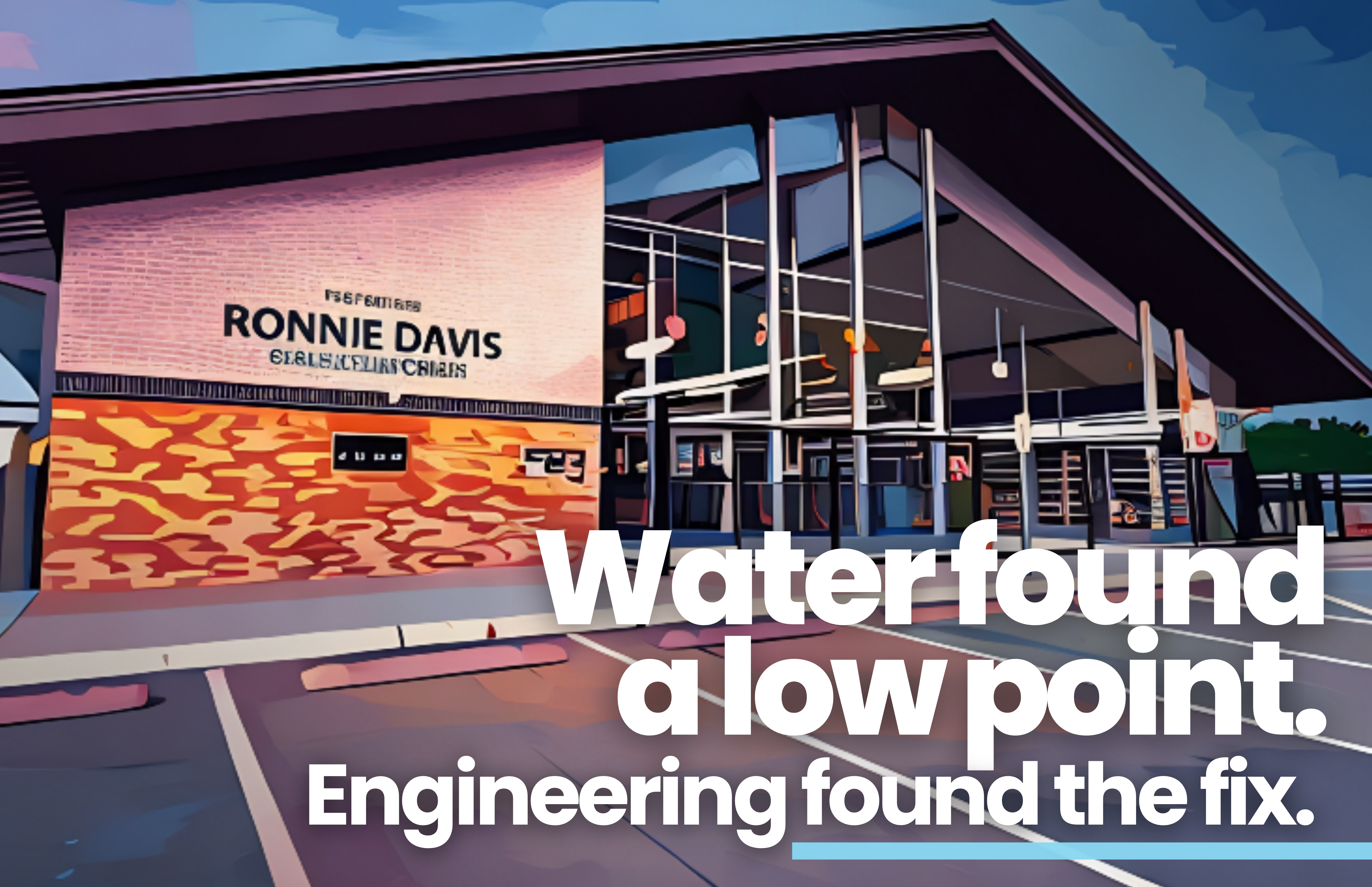 The Ronnie Davis FBISD Agriculture Facility spans 10,700 square feet across a 3.8-acre site in Missouri City. After construction, a critical issue surfaced: roof runoff needed a more direct path into the underground storm system to prevent ponding near the building and
